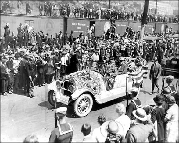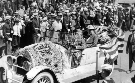In scanning the internet, Shawn and I came across a few “press-type” professional photographs of the event; they were mostly taken from streetside. Up close and personal. The best image showing the details of President Harding’s limousine – down to the carpet of flowers on the hood – and the First Lady’s hat found by Shawn on the internet: