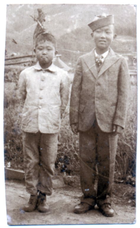 Dad on right next to his favorite brother, Suetaro. It is a tiny picture, about the size of a quarter, and it fell out from behind a larger picture glued in place in Granmother Kono’s photo album. Taken in front of family home in Hiroshima. My guess is 1928.