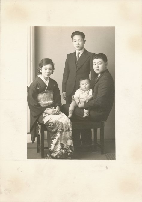 Dad (standing) with his sister-in-law and my Aunt Haru and his oldest brother Yutaka holding his first son Seiichi Robert. Robert would die at six years of age at the Minidoka prison camp in 1944. All would be imprisoned three years later by President FDR, a Democrat. Taken in Seattle 1938.