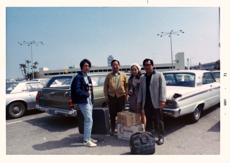 Dad still wearing that yellow sweater! His first new car (now eight years old in the picture) – a 1963 Mercury Meteor Custom – behind us at LAX, picking up Aunt Eiko and Uncle Paul (also a US 8th Army MIS veteran) who flew in from Tokyo. May 1971.