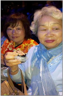 Masako savoring her Spam Musubi Kailua. Her daughter Izumi looks on.
