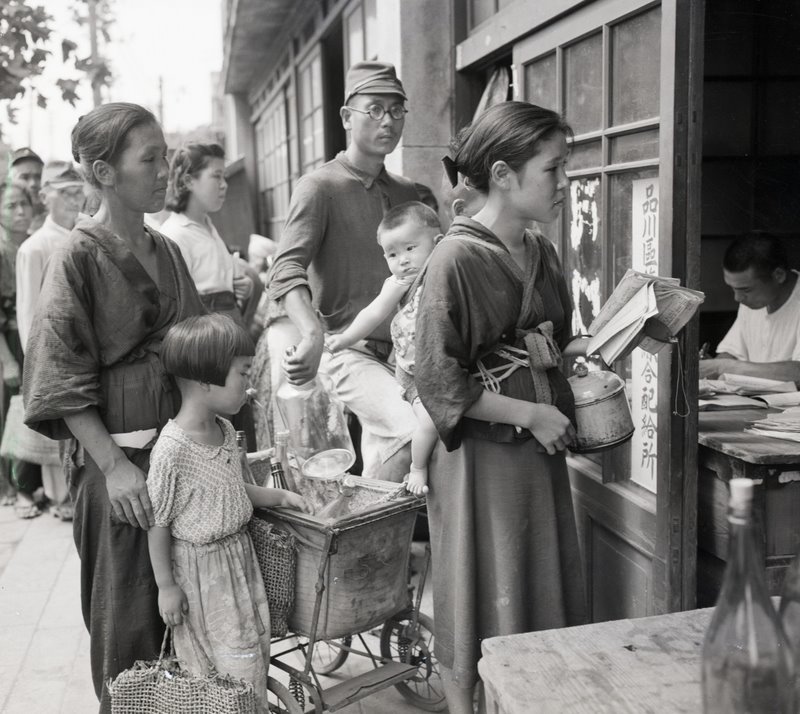 Civiians with ration books waiting in line for beans. Note the containers for carrying clean water. Japanese signage discloses this line was in Shinagawa, Tokyo. Note the orderliness of the civilians.