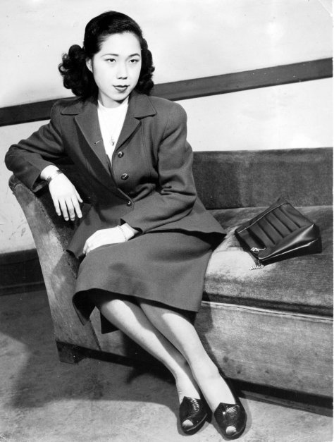 Original B&W. Note the handbag and shoes sent to her by Taro from Livingston, CA.On a sofa.
