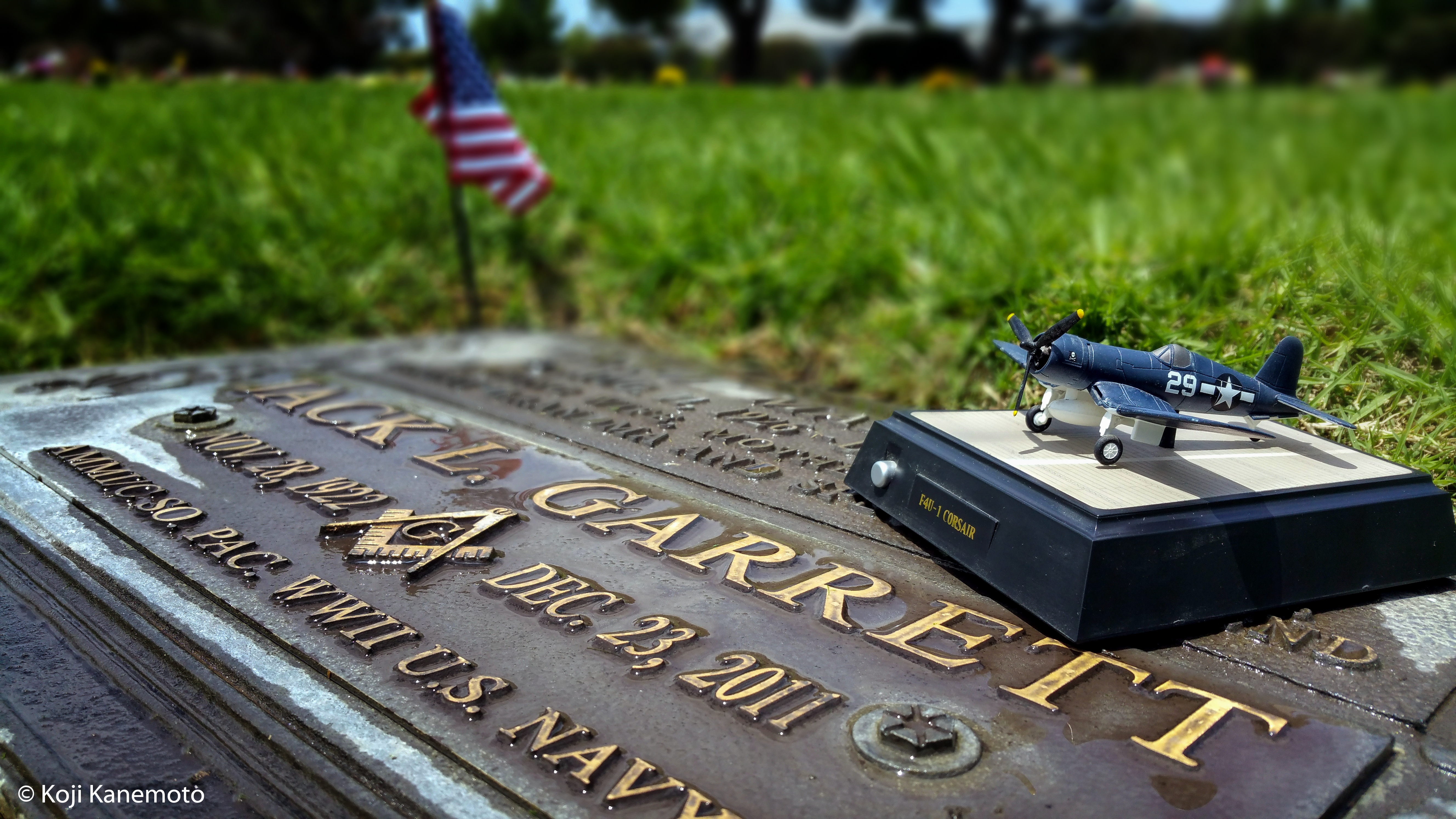 I had brought along something for Jack this time; something I thought he would enjoy. So after cleaning up his resting place, it was placed atop his gravestone – his beloved F4U Corsair:
