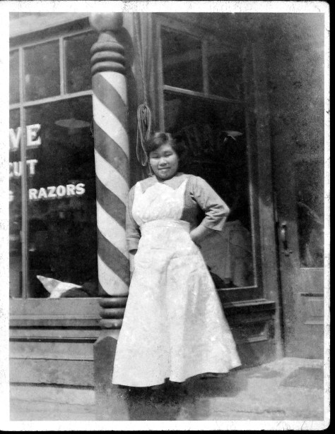 A young Grandmother Kono takes a modeling pose in front of her Seattle barbershop. She cannot possibly have foreseen what the future holds in store for her.