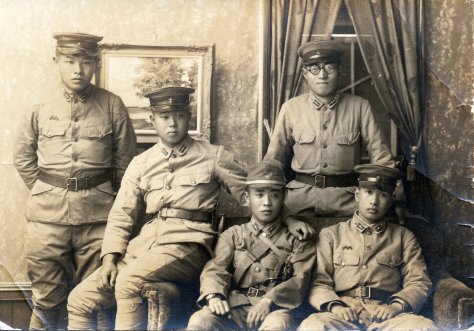 A proud looking Suetaro in his full Army uniform. I cannot tell if the handle on his katana, or “samurai sword”, is wrapped in silk or machine stamped. All military issued swords were numbered, by the way.