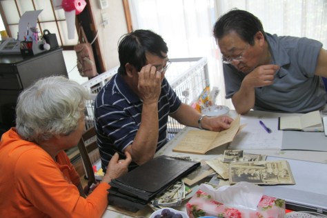 Masako shocked all of us when she brought out Suetaro’s Army diary. (L to R) Masako, Kiyoshi and Toshiro, her son. The Kleenex box is there for my use.