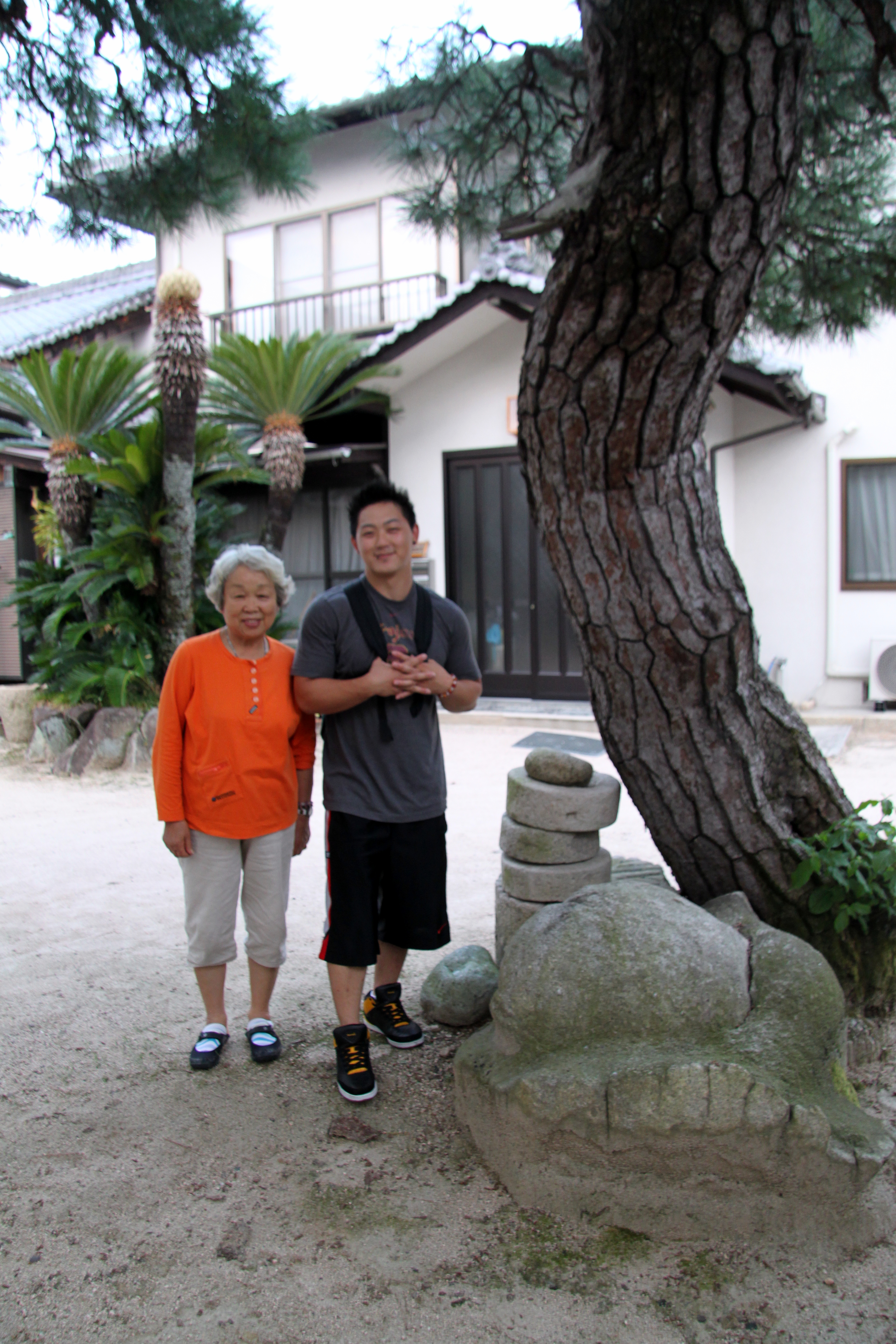 Masako and my son Takeshi stand next to the large round stone and pine tree made famous by my father some eighty-plus years ago.