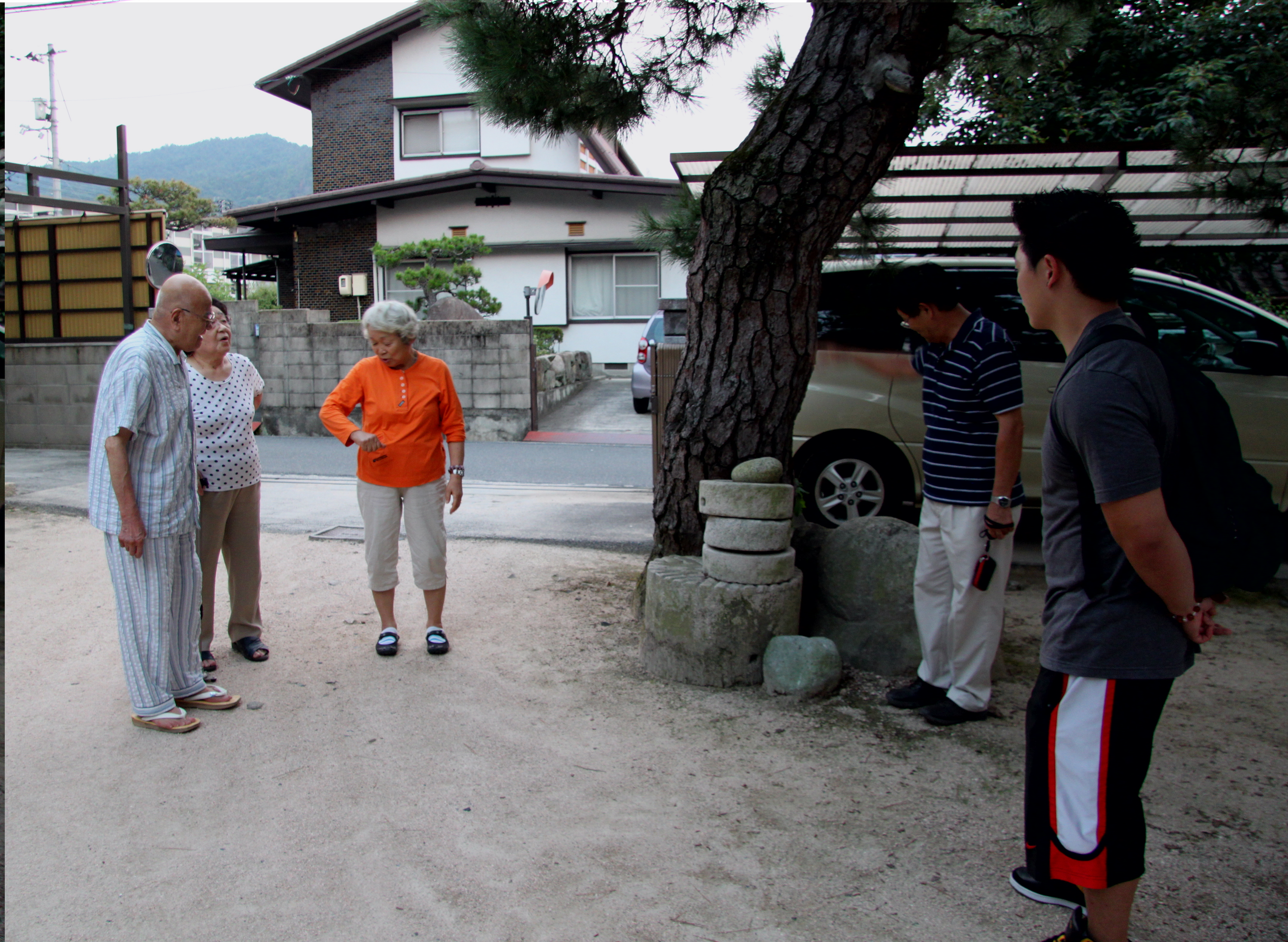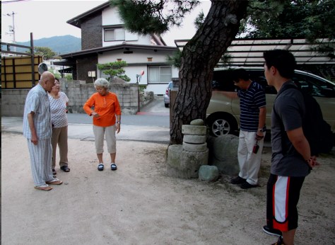 Masako is mimicking my father’s broken right elbow and his story while my son Takeshi and cousin Kiyoshi watch. Kiyoshi was pointing to the stone to supplement the story.