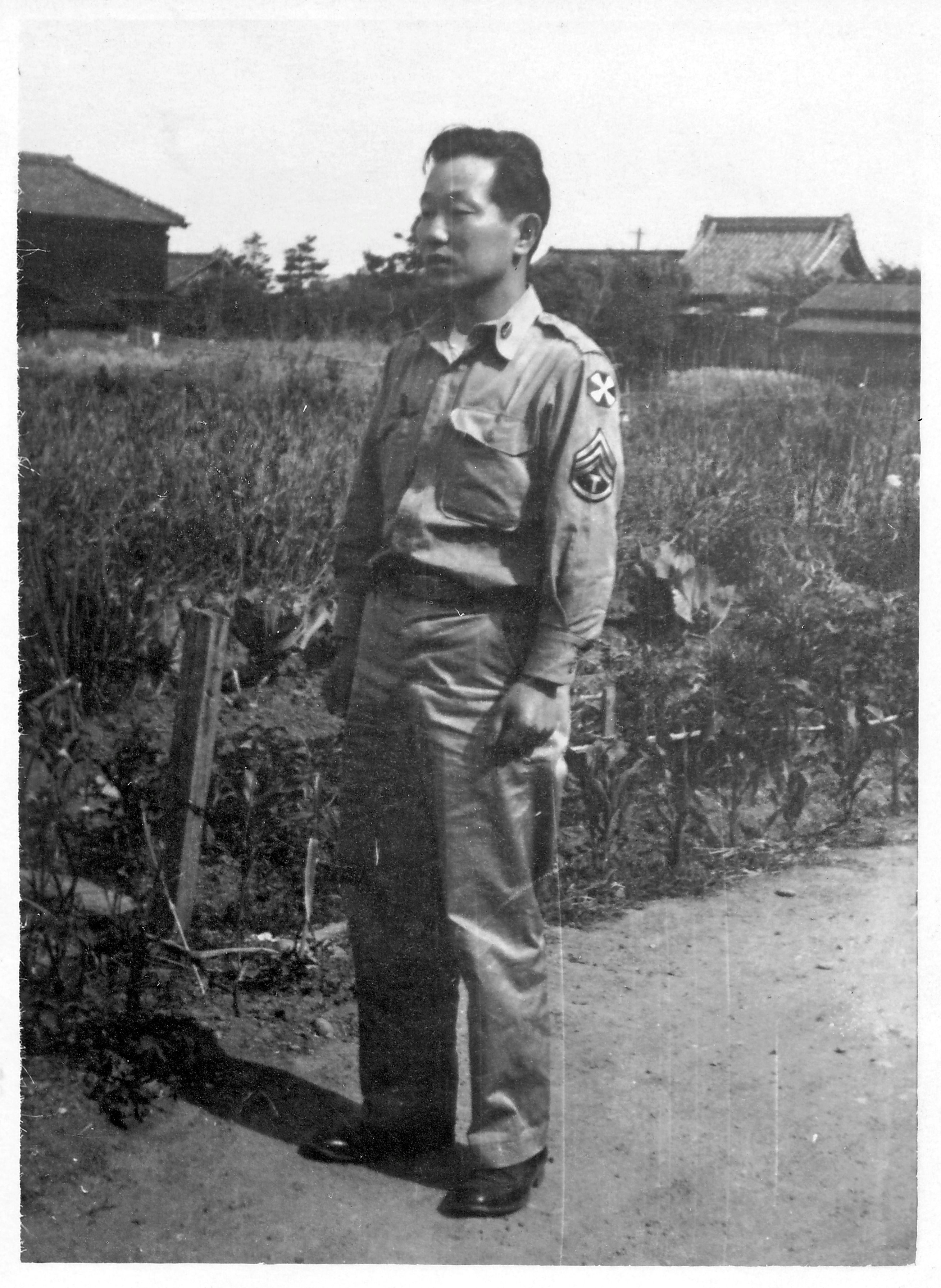 The tiled roof of “Shoukakuji” can be seen behind and to the right of Dad in this 1948 photo. He is standing alongside his childhood home.