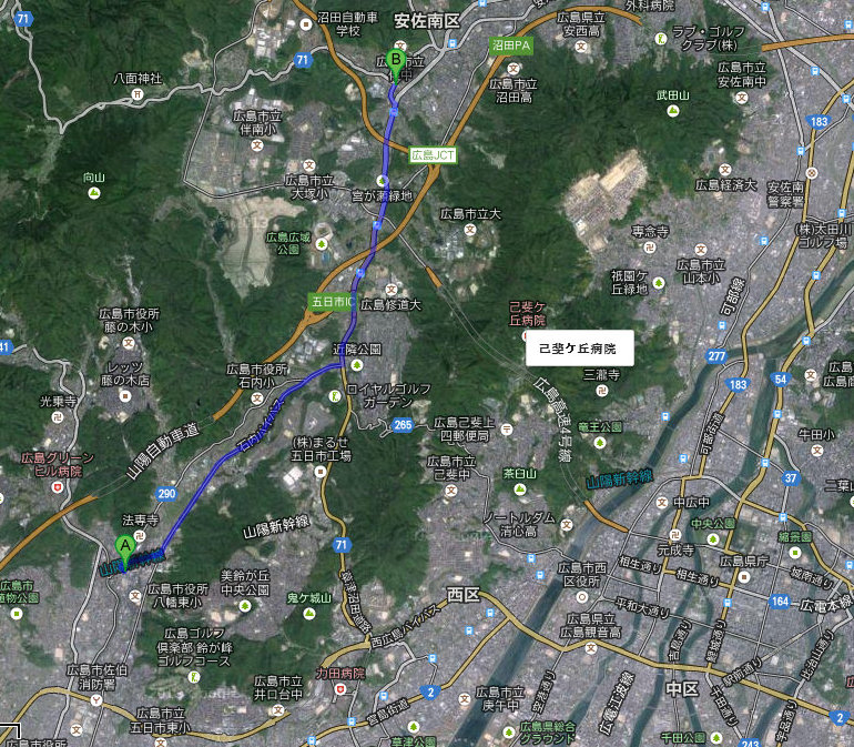 My father’s family home is at “A”; Aunt Michie’s home in the village of Tomo is at “B”. About five miles separates the two homes. The atomic bomb’s hypocenter is towards the bottom right where rivers split up.