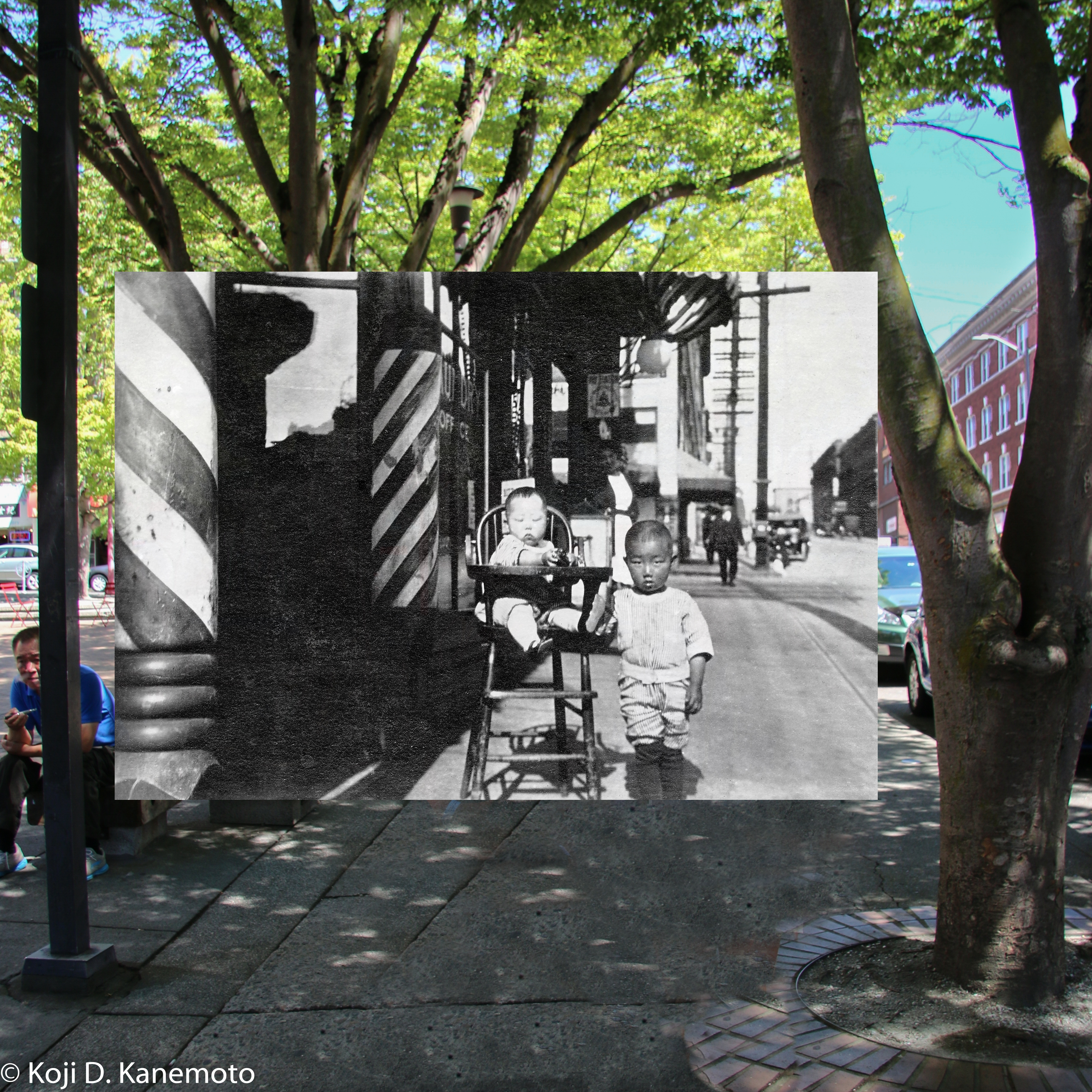(Clockwise) Grandmother Kono, Uncle Suetaro, an unknown girl and dad on tricycle. Dad says the corner brick building had a butcher shop at street level. Circa 1925. Color image taken at King and Maynard, June 25, 2015.Looking east up King Street. You can see the “Hotel Fujii” signage extending out from the hotel above my Grandmother. Year unknown but post 1917.At King and Maynard. Clockwise from Grandmother: Aunt Shiz, Uncle Suetaro, Dad and baby Mieko. Based on baby Mieko, likely 1925.Grandfather Hisakichi at far right, taken at Mt. Rainier August 1919. Finding a similar location on Mt. Rainier was a long shot but I had hoped this location in 1919 would not be far from current road stops as they were traveling in a 1913 Chevrolet Classic Six (Note 1). The 2015 color shot was a few hundred yards from the Rainier Inn.Aunt Shiz dancing on left, looking east up King Street. The bottom of the Hotel Fujii signage is above the girls. My guess is circa 1923.Grandmother Kono holding baby Mieko. Uncle Suetaro is peeking over the chair looking at his sister. Dad is standing in the middle with Aunt Shiz to his right. The lady is unknown as is the child but we suspect it is Mrs. Fujii. King and Maynard, circa 1923.Dad and Uncle Suetaro in front of Grandfather’s barbershop. Circa 1922, King and Maynard.Although a poor recreation, Grandfather is standing at right with his hand on an unnamed male buddy. He is in other photos. Taken at the entrance to Grandfather’s barbershop (best guess as to location). Circa 1917.