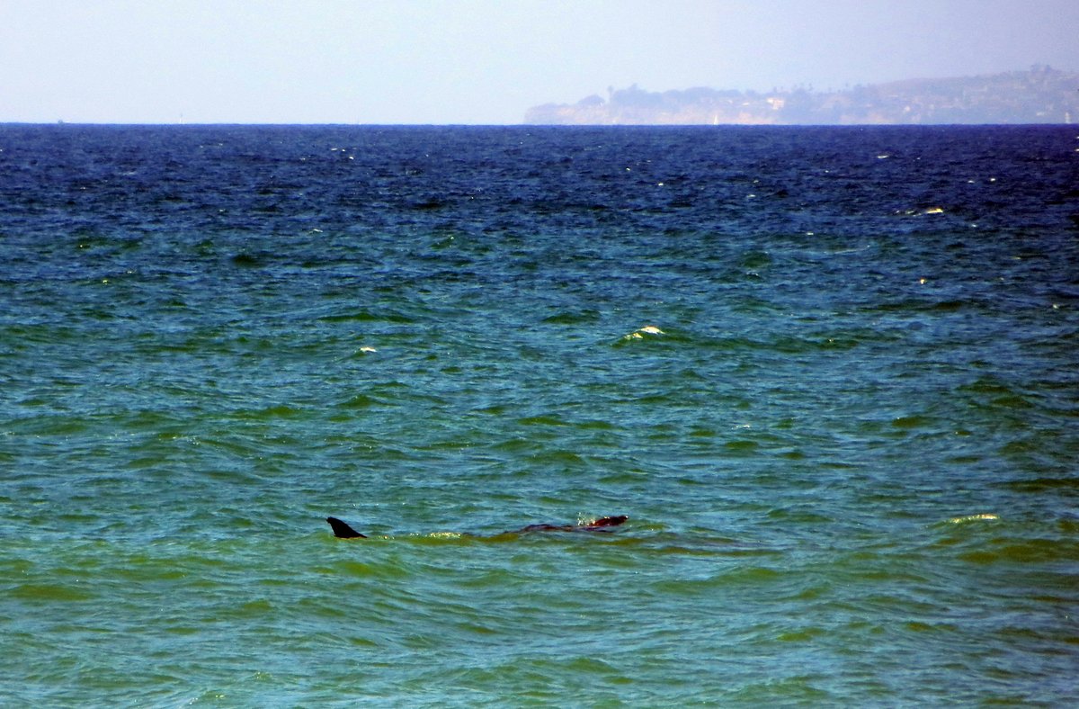 Three dolphins just off the beach and right in front of them.