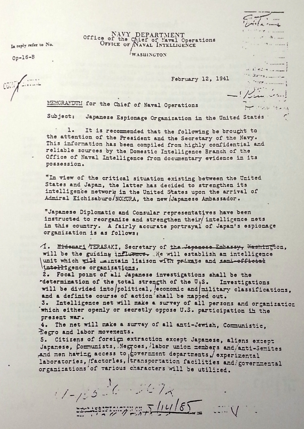 February 5, 1941 – Tokyo instructed the diplomats to come up with a contingency plan in the event something were to happen (i.e., war). To always exercise due care and to look at Central/South America for continuing intelligence efforts.