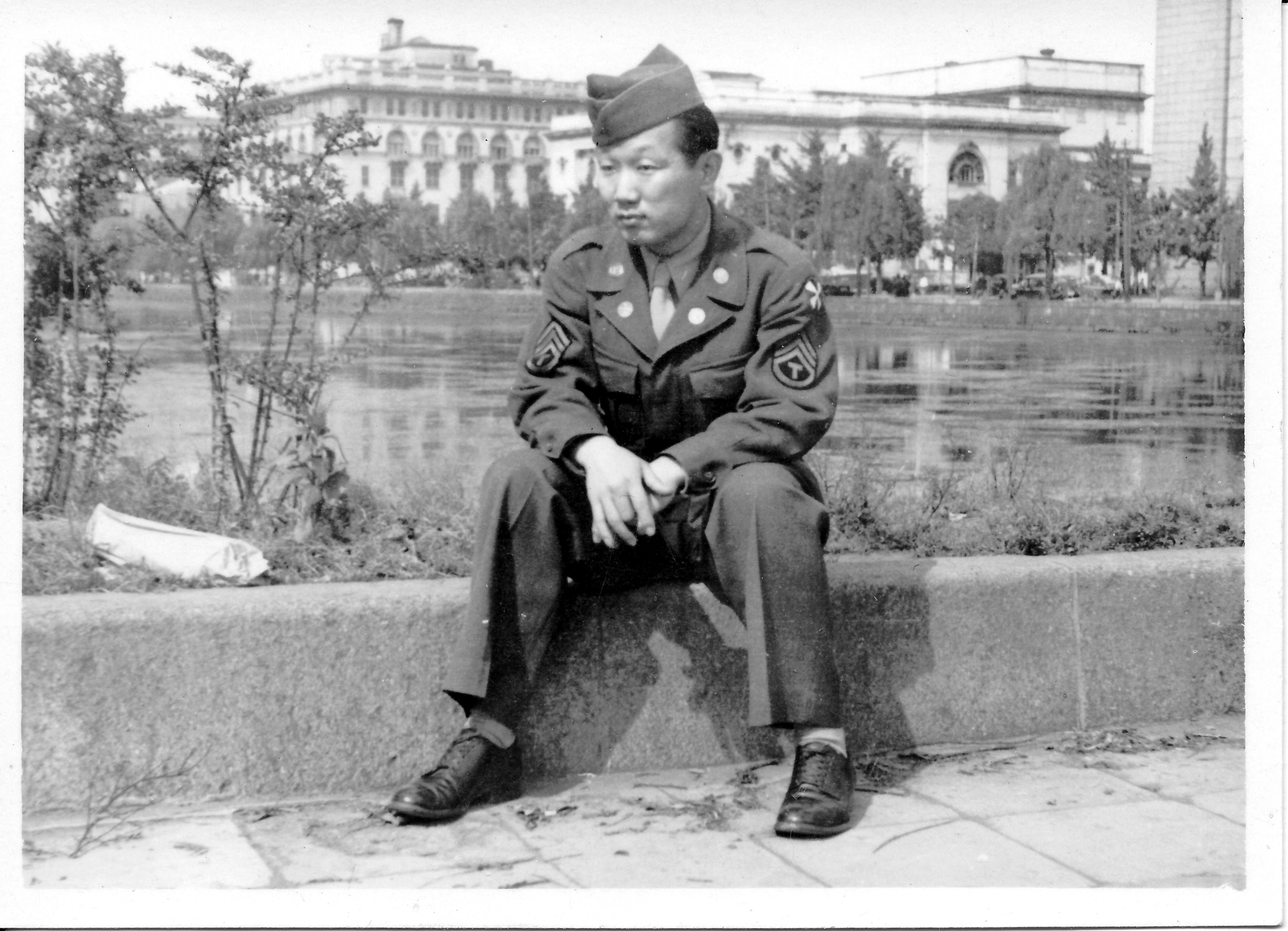 Dad sitting in front of MacArthur’s GHQ in Tokyo 1947. Judging by the date, the remnants of the Japanese military had officially just informed his mother in October 1947 that Suetaro would not be coming home.