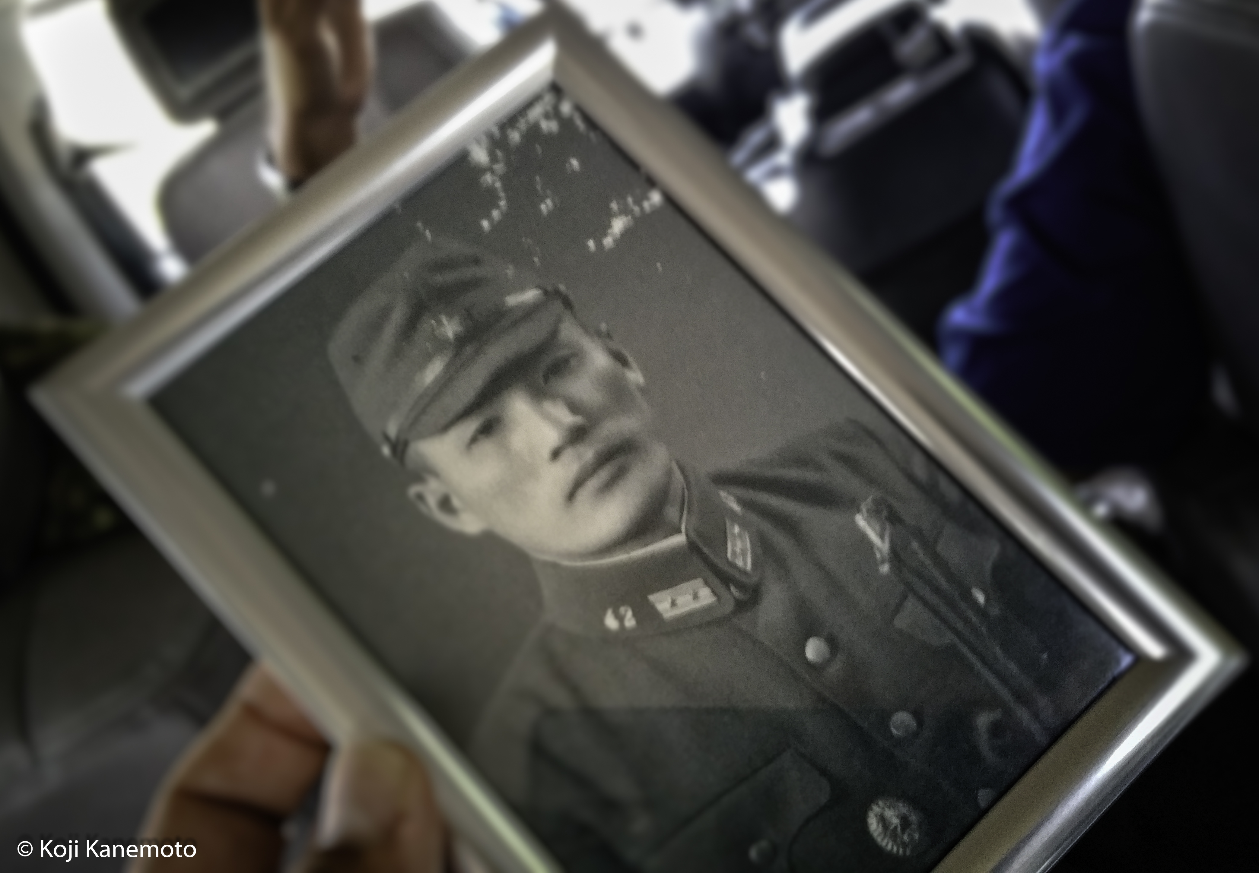 Ms. Teraoka’s uncle, Lt. Nakamura, is also on the memorial table. He survived for months only to be killed in action towards the end with the tattered regimental flag tied around his waist.Cousin Tomiko offers gassho and incense to the fallen soldiers. At the time of the atomic blast, she was inside her home which toppled above her.