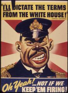 Then, the American propaganda machine took over. They picked up what Yamamoto supposedly said and changed its meaning even more. Posters sprang up all over the place with purposely and understandably exaggerated caricatures demonizing Yamamoto… but most of all, very much mutating the questioning feelings of Yamamoto. Time Magazine even took part.